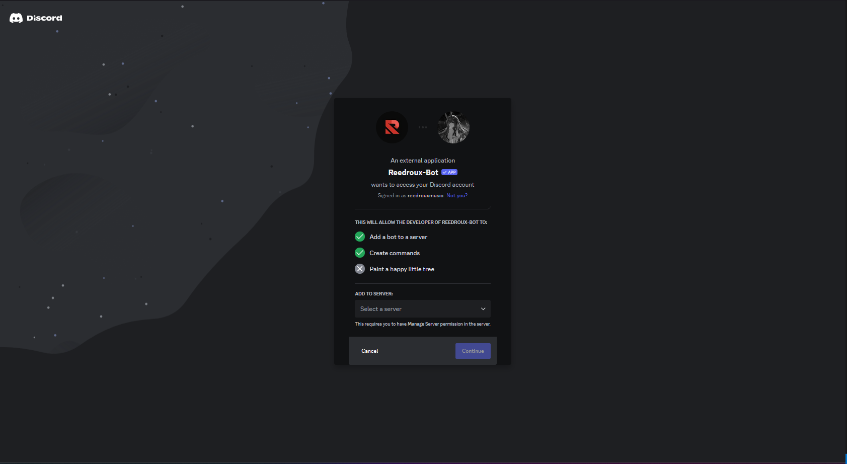 Once you've selected the server that you'd like to add Reedroux to, you can press the Continue button on the bottom right of the menu.